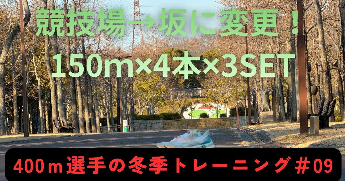 今回は急遽坂に場所が変更になったので、200mテンポ走の代わりを考えて150mの上り坂に変更。